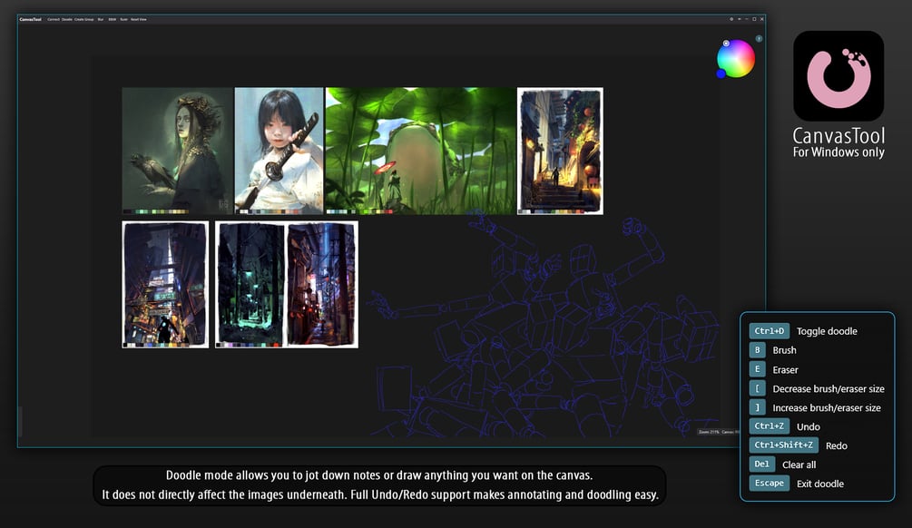 Canvas Tool is a WPF (.NET 8.0) desktop application specifically designed for digital artists to manage and organize reference images, featuring real-time drawing window capture capabilities and blur/b&w filters to control values and overall composition while painting.